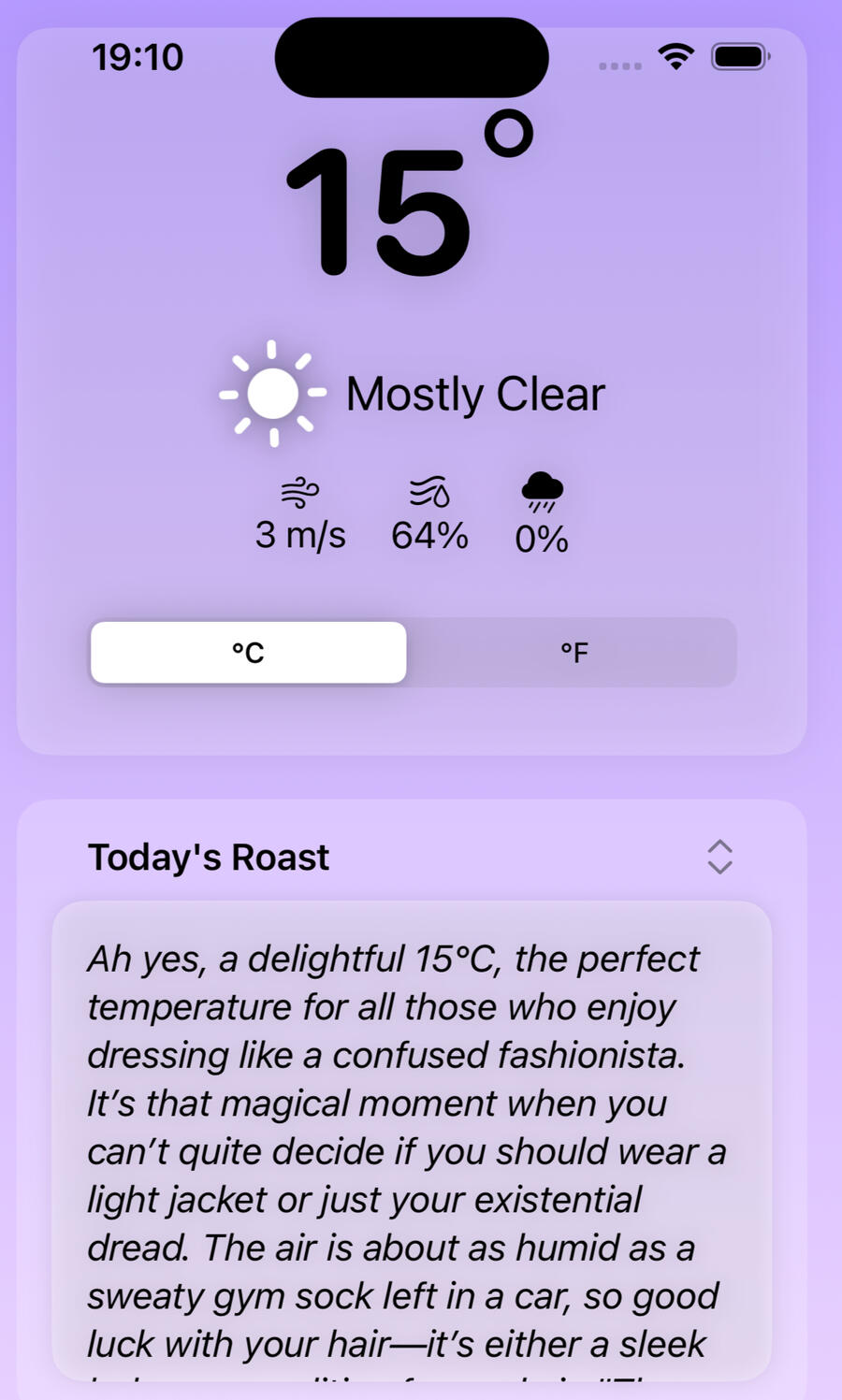 Get weather forecasts with a side of sass! Our sleek app delivers accurate predictions and hilariously biting commentary. Stay informed and entertained, rain or shine